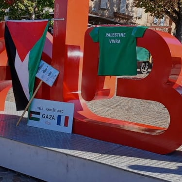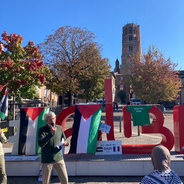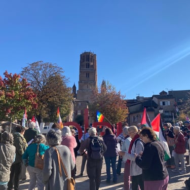Le 22 septembre dernier, la France a officiellement reconnu l’ État de Palestine. Ce geste historique, si souvent retardé, ouvre une nouvelle étape dans la lutte pour la paix et la justice au proche- Orient. En soutien de cette annonce, plusieurs mairies ont accroché le drapeau palestinien. Mais à ce jour, la mairie d’Albi n’en a pas fait autant. Nous appelons la municipalité à se montrer à la hauteur de cet événement historique en hissant, au côté des drapeaux français et européen, le drapeau palestinien. Au delà de ce geste de solidarité symbolique, nous voulons inscrire notre action dans le temps long et dans le concret. D’où le rassemblement qui a eu lieu ce samedi pour fêter un jumelage citoyen avec Gaza. Ce jumelage ne dépend pas des institutions, mais de la volonté des citoyens : bâtir des ponts là où d’autres érigent des murs. Nous avons donc eu recours à une procession depuis le marché couvert avec les chants de la chorale hebdomadaire «chanter pour Gaza » pour terminer sur la place du château.